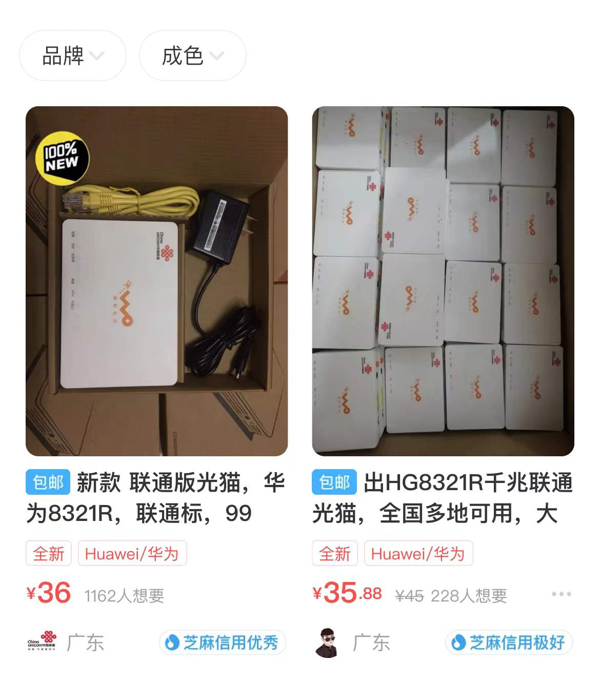 这里也教大家一个省钱的窍门,大家可以去某海鲜二手平台,搜索自己本地区(最少是本省,最好是本市)的相同运营商的千兆光猫(家里是联通的就买联通光猫,是移动就买移动以此类推),价格通常只需要几十元,然后再给10010打电话让他们来进行账号绑定即可,这样就不需要支付200多块钱的押金了,是一个成本相对低廉的方式。